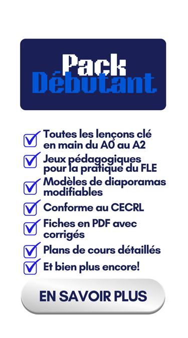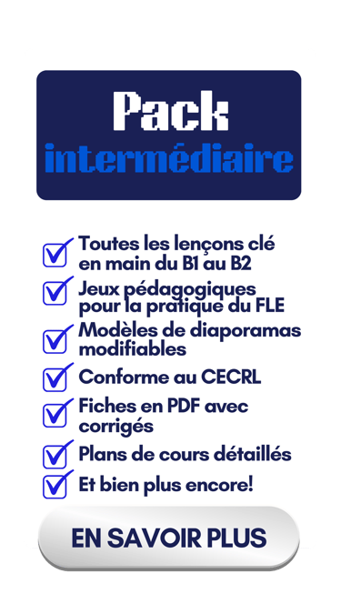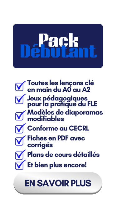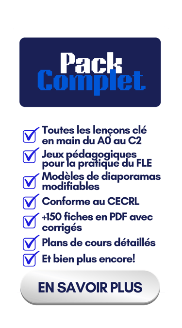 Accès à vie, diaporamas complets, modèles modifiables, jeux pédagogiques pour la pratique du français, fiches PDF pour les élèves, corrigés, activités, documents authentiques, plans de cours et bien plus encore!